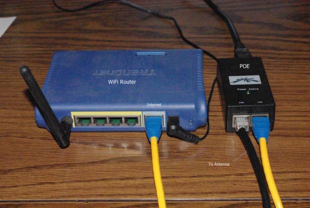 1) Check the CAT5 cable from your router to our POE (the yellow one in the picture below). Disconnect each end and then reconnect and try the internet. Be careful not to disconnect the CAT5 cable that goes out to the Antenna.